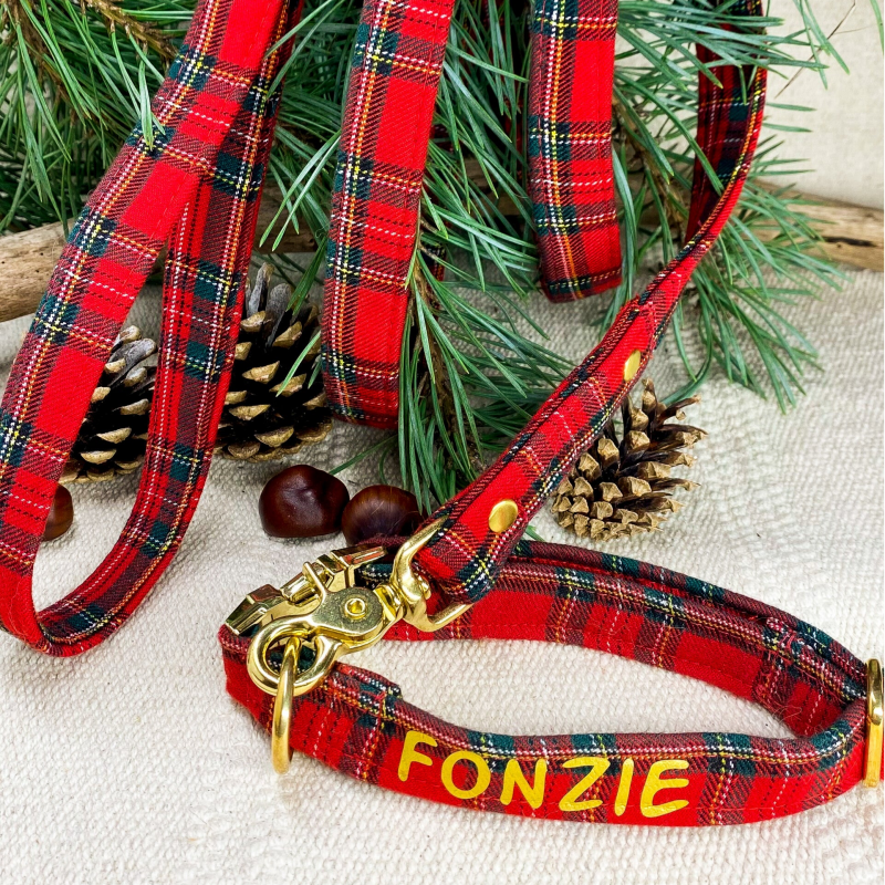 Deze Red Tartan halsband is een mooie, sfeervolle, gepersonaliseerde hondenhalsband in de stylish stof Tartan Red. Perfect voor de winter en voor een christmassy stijl. Deze handgemaakte verstelbare halsband is afgewerkt met een degelijke, veilige messing kliksluiting en musketon en gouden hardware.