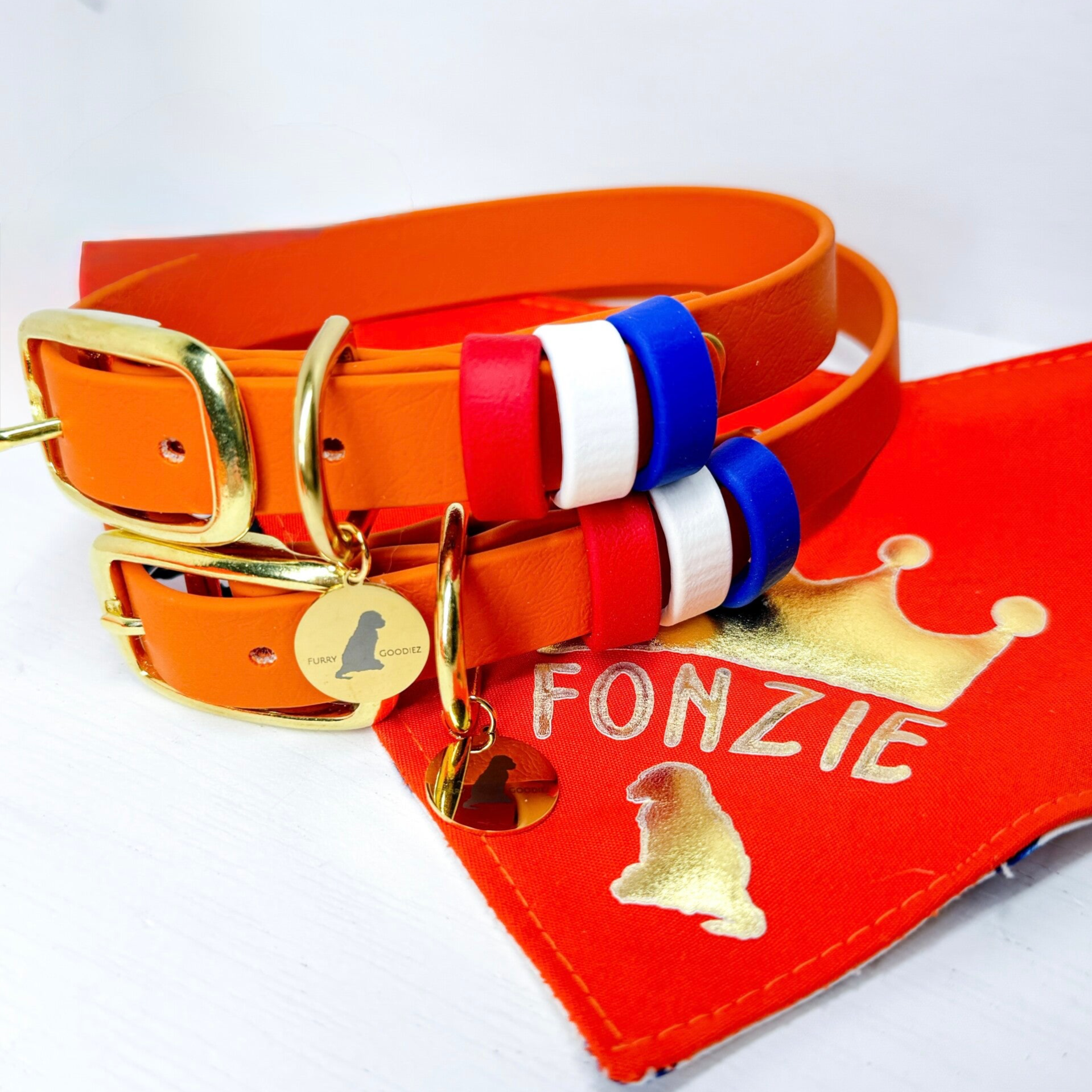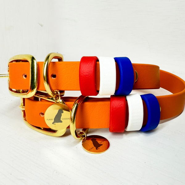 Een waterdichte en comfortabele BioThane halsband in oranje met rood wit blauw accent en messing details waarmee jouw hond veilig en stijlvol Koningsdag viert.